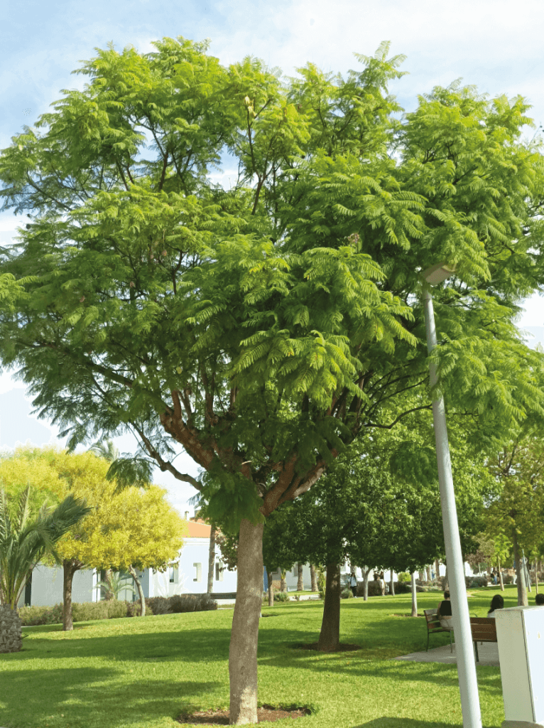 Árbol caducifolio oriundo de América del Sur de una docena de metros en su máximo desarrollo. Las hojas son doblemente divididas y tiene una floración muy abundante y espectacular.